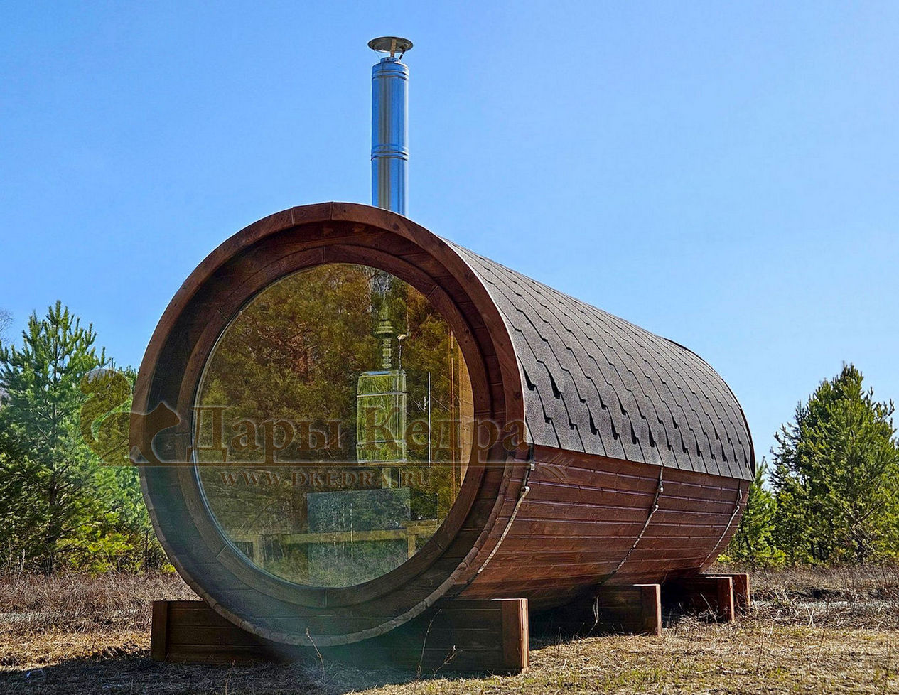 • Баня-бочка «Орео» с панорамным окном Стильная и современная баня-бочка может быть выполнена длиною от 3 метров, что-бы парильное отделение было не менее 2,5 метров для безопасного расстояния человека от печи. Полок одноуровневый, что позволяет в полной мере наслаждаться видом из панорамного окна. Печь идёт с внутренней топкой по центру, её можно установить сбоку с топкой внутри, снаружи, либо вынести топку в соседнее отделение. Печь можно укомплектовать баком для воды, а саму баню сделать длиною до 6 метров, комфортно разместив в ней дополнительно помывочную и комнату отдыха. Если вы хотите добавить круглое окно (полукруг) в комнате отдыха, то предлагаем рассмотреть модель с боковым входом.