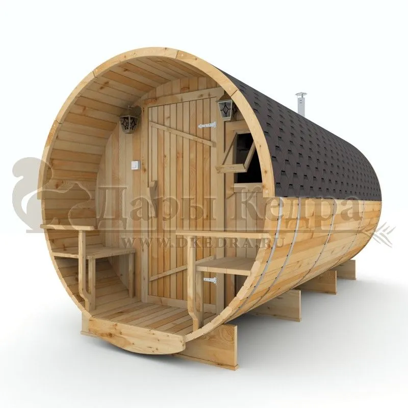 • Баня-бочка круглая из кедра 3 метра Это изделие круглой вытянутой формы с двумя отделениями: раздевалкой и парной. Лавочки из кедра находятся по всей длине бани-бочки с обеих сторон. Печь расположена в парилке около дальней стены. Для удобства пользования в раздевалке установлена вешалка и полочка из кедра. За счет небольшой конструкции баня нагревается не более 30 минут. По вашему желанию баню-бочку можно дополнить печью с внешней загрузкой, благодаря которой весь мусор после топки останется на улице. Круглая баня-бочка не требует полноценный фундамент, поэтому при необходимости ее можно перенести в другое место. Обращаем Ваше внимание, что в стандартную комплектацию бани входят лавки в парной с обеих сторон. Дополнительно можно заказать полок открытого или закрытого типа! Кедр обладает ароматическими свойствами. Он не деформируется и влагоустойчив, при правильном уходе за деревом на нем не развиваются грибки и плесень.
