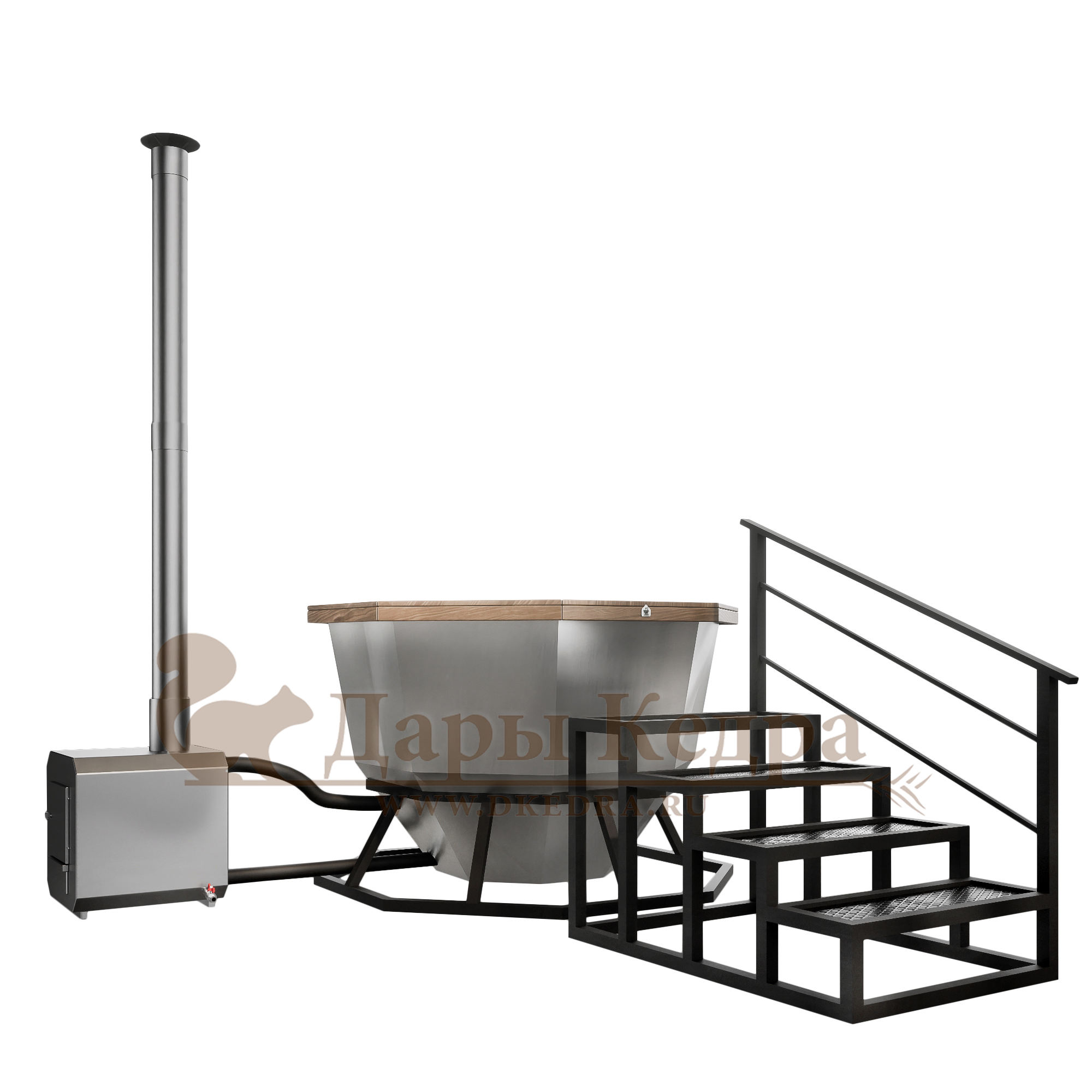 Банный чан из нержавеющей стали Ø-2000 на подставке с ветрозащитой и печью СТ3 Банный чан с ветрозащитой изготовлен из пищевой стали. Представляет собой большую ёмкость в виде чаши, при нагревании которой можно париться на свежем воздухе. Банный чан установлен на металлическую закрытую подставку, которая служит защитой от ветра и печью одновременно. В комплект такой модели входит дымоход 2 метра. Чан оборудован кедровым бортом, скамейками, подспинниками, трапом для ног и приставной лестницей.