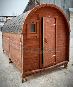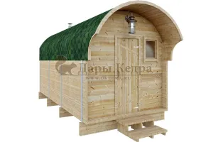 Это более просторная модель за счет увеличенной высоты потолков и ровного пола. В такой модели раздевалка совмещена с моечной. Тут установлен душевой поддон, вешалка, полочка и лавочка из кедра. В парильном отделении по обе стороны расположены двухуровневые открытые полки, печь находится между ними у дальней стены. Время растопки такой бани не превышает 30 минут. По вашему желанию баню-бочку можно укомплектовать козырьком, верандой и печью с внешней загрузкой, благодаря которой весь мусор во время топки остается на улице. Баня-бочка буханка не требует полноценный фундамент, поэтому при необходимости ее можно перенести в другое место.