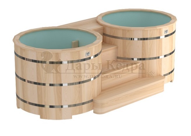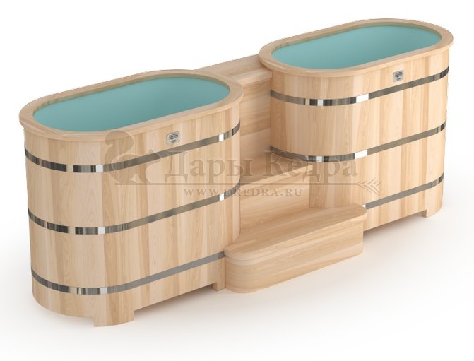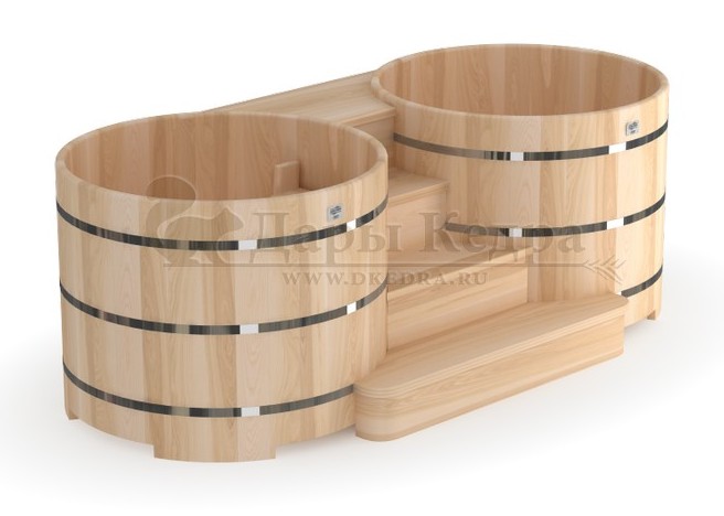 • Двойная овальная купель для бани из кедра Двойная купель из кедра чаще всего используется в крупных банных комплексах и оздоровительных центрах. Она представляет собой две овальные чаши для воды, в которых люди отдыхают после парения. Между купелями установлен широкий подиум из кедра, по которому могут спускаться и подниматься сразу несколько людей. Для комфортного отдыха купель оснащена лавочками и двумя дополнительными лестницами. Обручи из нержавеющей стали декорируют изделие и равномерно распределяют нагрузку воды во время пользования. При правильном уходе купель для бани не рассыхается и не подвергается гниению. При взаимодействии древесины кедра с водой активируются эфирные масла и фитонциды, благодаря чему организм насыщается полезными веществами.