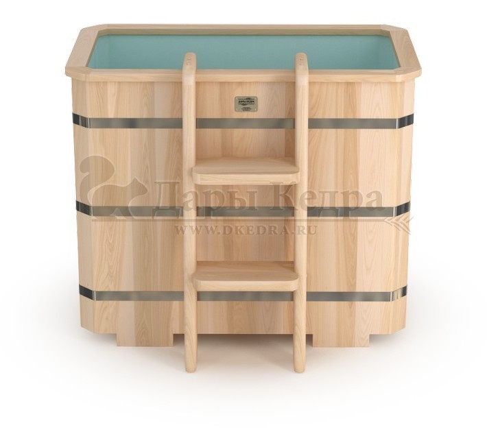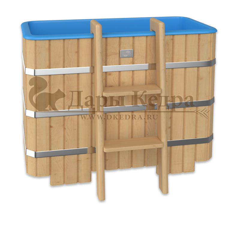 • Прямоугольная купель для бани из кедра Представляет собой герметичную емкость для воды из кедра, которая предназначена для отдыха и охлаждения тела после процедур парения. Ширина прямоугольной купели равна ширине стандартных дверных проемов (78 см), поэтому занести в помещение ее можно в собранном виде. Благодаря прямоугольной форме купель хорошо впишется в угол помещения. Так же ее можно установить на улице. Прямоугольная купель оснащена лавочками, приставной и внутренней лестницей из кедра. Обручи из нержавеющей стали плотно прилегают к изделию, что позволяет равномерно распределить нагрузку воды и сохранить форму во время эксплуатации. При правильном уходе купель для бани не рассыхается и не подвергается гниению. При взаимодействии древесины кедра с водой активируются эфирные масла и фитонциды, благодаря чему организм насыщается полезными веществами.