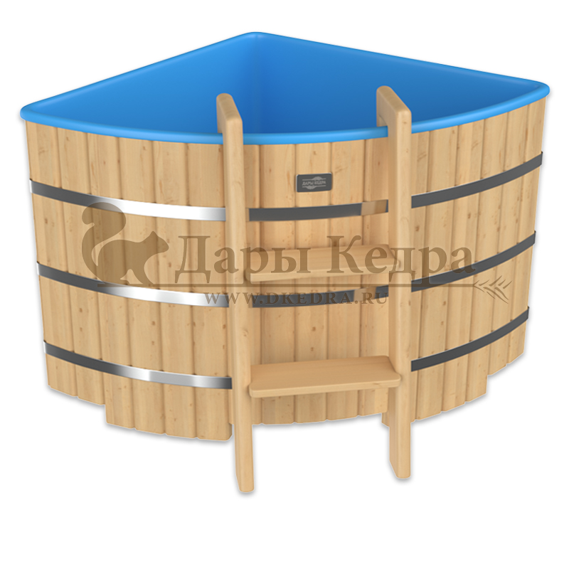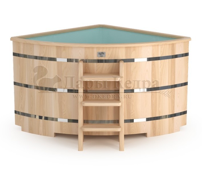 • Бондарная угловая купель из кедра с пластиковой вставкой Особенность этой модели заключается в сборке купели по технологии лунный-паз. Паз (углубление) одной доски прочно соединяется с выемкой следующей. Такая сборка осуществляется без клея и гвоздей. Готовая конструкция прочно фиксируется нержавеющими обручами. Пластиковая вставка придает изделию красивый внешний вид, увеличивает срок службы и облегчает уход за купелью. Для удобства пользования купель оснащена лавочками, приставной и внутренней лестницей из кедра. Подходит для комнатного и уличного использования. Купели с пластиковой вставкой рекомендуется заказывать для непрерывного использования в банных комплексах или оздоровительных центрах. Внутренняя чаша облегчает уход за изделием и увеличивает срок службы купели.