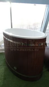 Это купель с внутренней овальной чашей, которая изготовлена из современного прочного и термоустойчивого материала (композита). Форма чаши обеспечивает комфортную посадку внутри изделия. Для удобного использования купель оснащена приставной лестницей. Обручи из нержавеющей стали декорируют купель с композитом и равномерно распределяют нагрузку во время процедур.