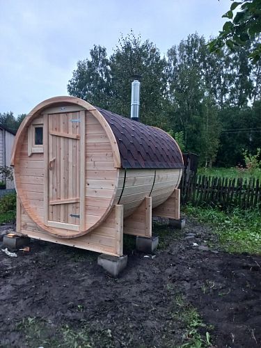 Много читал про такие бани-бочки, долго анализировал, в итоге пришел к мнению, что трехметровая баня-бочка-это оптимальное соотношение цены и качества, пространства. Кстати, в ней вполне хватает места даже для одновременного нахождения 3-4 человек, комфортнее, конечно, вдвоем)). Смотрится на участке красиво! Несколько раз протестировали баньку, остались очень довольными, а впереди целое лето...будем париться почти каждый день))